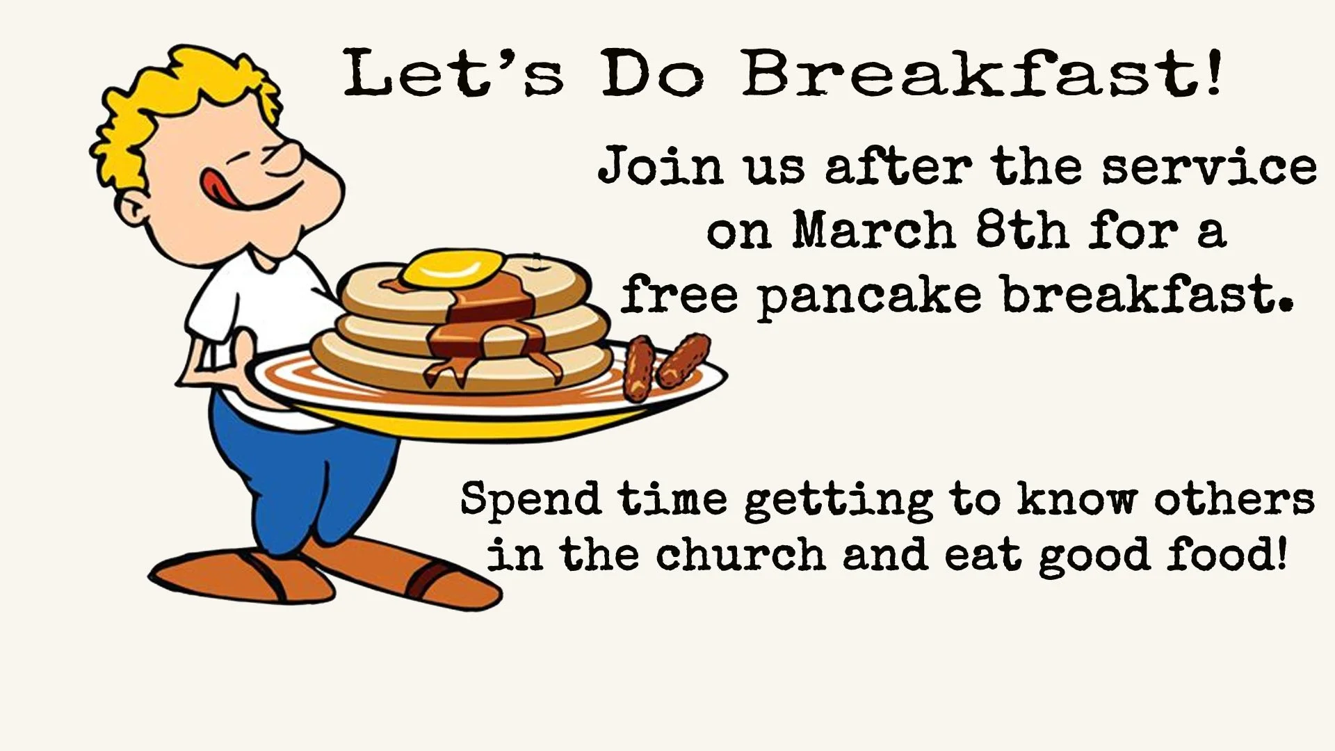 Let’s do breakfast! Join us for a free pancake breakfast immediately after the service on Saturday, March 8th, 2026. Enjoy a delicious breakfast filled with fluffy pancakes, syrup, and toppings, all served in a warm and welcoming atmosphere. This is a great opportunity to connect with friends, meet new faces, and enjoy a hearty meal. Everyone is welcome, so why not invite a friend for a great message and great food? A huge thank you to all the volunteers and groups that come together to serve us all in such a wonderful way!