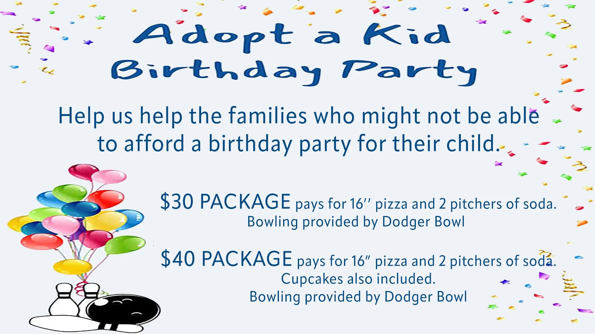 The monthly serving focus for February is called Donate a Birthday Party! There are families in Iowa County that are unable to afford a birthday party for their child. The owner at the Dodger Bowl has stepped up to the plate and has created a way that these kids can have a fun time with pizza and bowling. Your financial donation this month will help give a kid a cherished memory. To participate, you can: